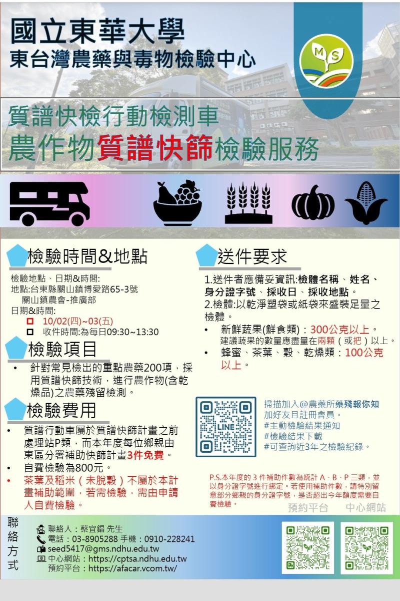轉知國立東華大學東台灣農藥與毒物檢驗中心提供「農作物質譜快篩檢驗服務」