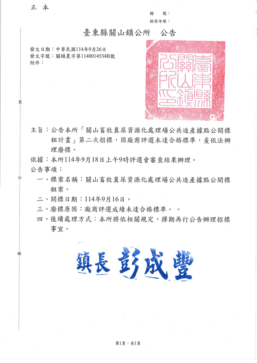 主旨:公告本所「關山畜牧糞尿資源化處理場公共造產據點公開標租計畫」第二次招標,因廠商評選未達合格標準,爰依法辦理廢標。