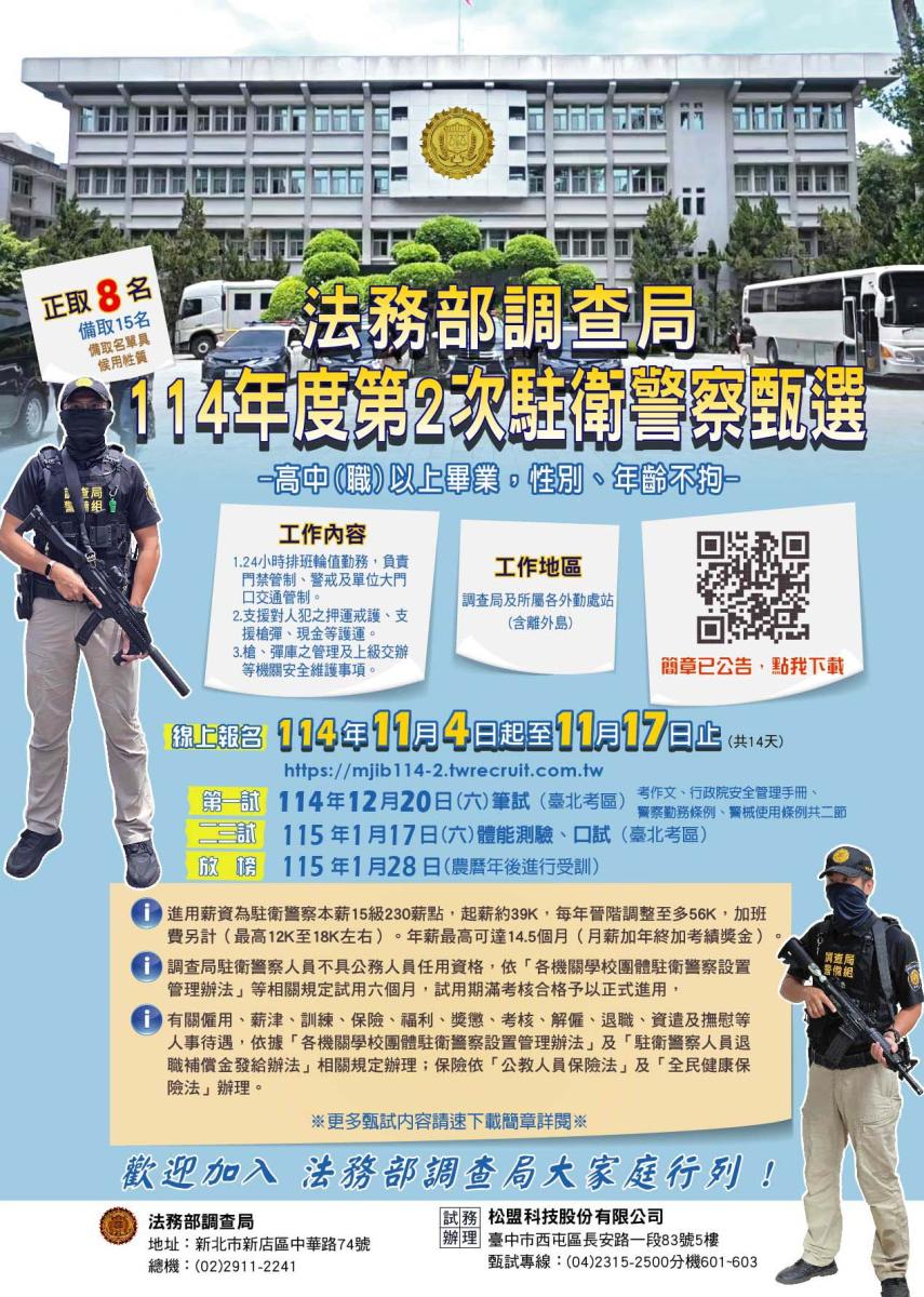 轉知法務部調查局將辦理 「114年度第2次駐衛警察甄選考試」