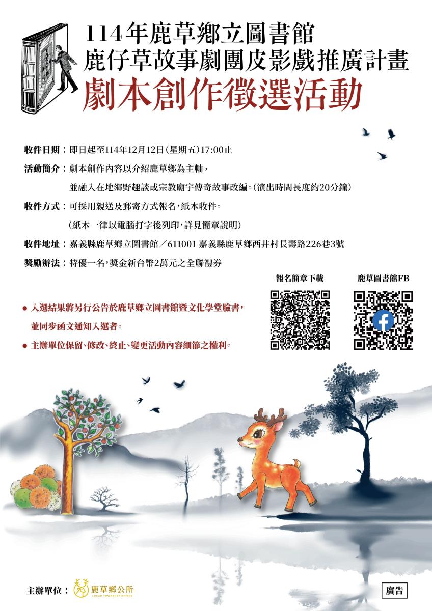 一、 旨揭活動邀請國內優秀創作者投件,以鹿草鄉在地特色、宗教傳說故事或鄉野趣聞等為創作題材,遴選切合主題且劇情精彩的皮影戲優秀劇本,並交由本所文化志工之故事劇團參與製作、排練等事宜,並於來年進行展演推廣。