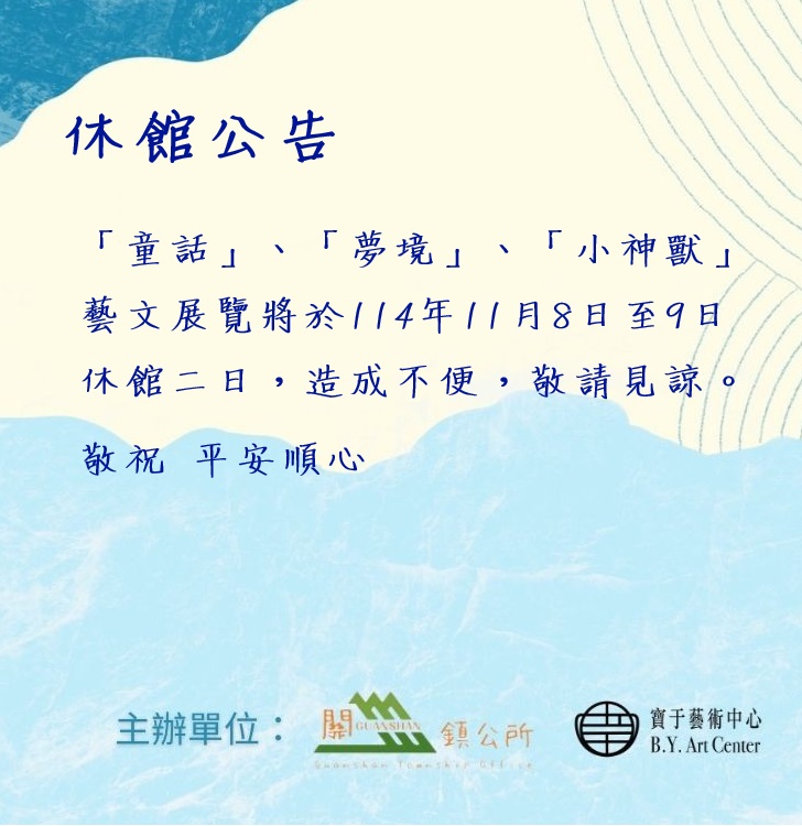 📢【休館公告】 「童話」、「夢境」、「小神獸」藝文展覽將於114年11月8日至11月9日休館兩日。 造成您的不便,敬請見諒🙏 感謝大家的支持與體諒,祝您平安順心💫 主辦單位:關山鎮公所、寶于藝術中心 #關山鎮公所 #寶于藝術中心 #展覽公告 #休館通知