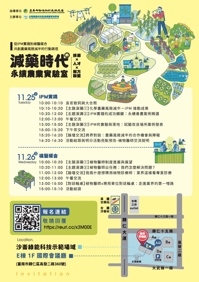 二、 「減藥時代的永續農業實驗室」成果發表暨交流活動旨在搭建跨領域合作平臺,匯聚產官學研共同展示減藥技術成果與友善資材應用案例,並推動植物醫師與潛在聘用單位的對話與連結,共同邁向健康、安全、永續的新農業,邀請各界蒞臨指導。