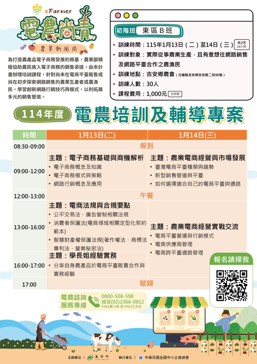 二、 旨案為打造農民對於農產品電子商務的發展根基,農業部特委託該會於全國各地區舉辦電農培訓專班,旨揭課程擬於115年1月13日(二)至14日(三)辦理,以強化學員有關電子商務基本知能,並積極協助進入電子商務銷售渠道。