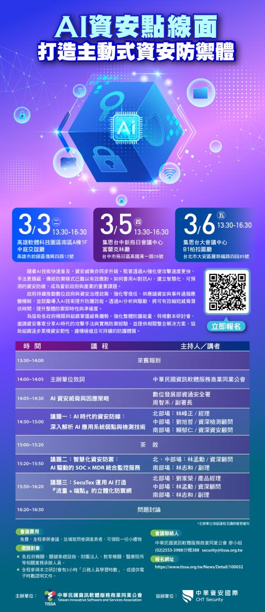 二、 因應 AI 技術快速發展,資安威脅型態持續演進,駭客已大量運用 AI 技術加速攻擊與規避偵測,傳統防禦模式已顯不足;本研討會聚焦 AI 時代之資安威脅趨勢、實務防禦策略及整合應用,對提升機關整體資安防護與應變能力具實質助益。