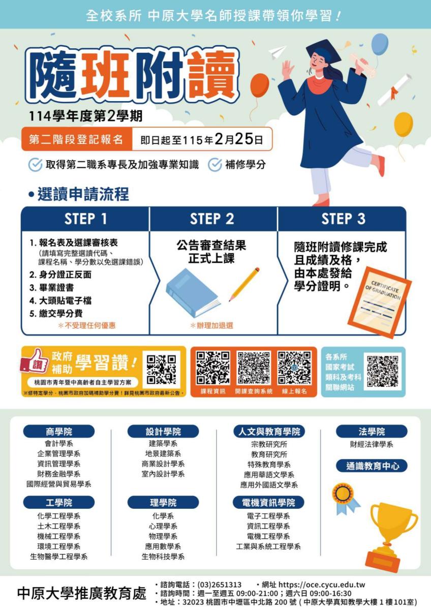 一、 本校開放114學年度第2學期學士、碩士學分專班(隨班附讀),第二階段報名登記至115年2月25日止。