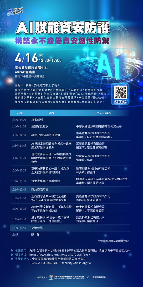 (二)場次二:AI 賦能資安防護(將於115年4月16日(星期四)假臺大醫院國際會議中心402AB,報名網址:https://www.tissa.org.tw/Course/Detail/5967)