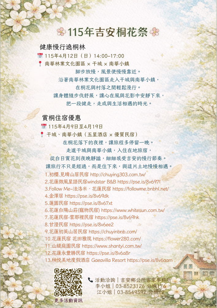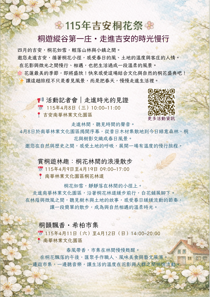 一、 為推廣本鄉客家文化藝術與自然景觀之美,本所規劃辦理「2026吉安桐花祭」系列活動。本次活動特別結合南華林業文化園區之歷史底蘊,透過慢行體驗、藝文市集與在地住宿優惠,引領民眾走進自然,感受土地與人文交織的時光慢行。