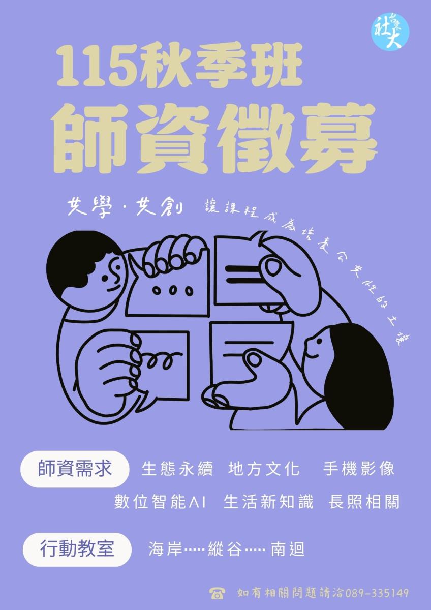 三、 依據社大辦學理念徵募115年秋季班師資暨課程需求如下: