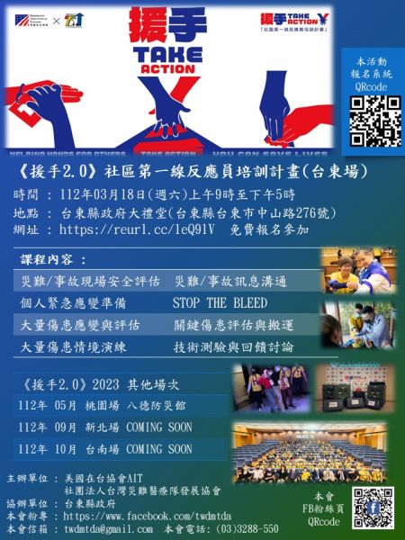 二、該協會與美國在臺協會共同主辦《援手2.0》社區第一線反應員培訓計畫,透過課程與實際演練,學習急救、止血與災害來臨時的應變反應技能。