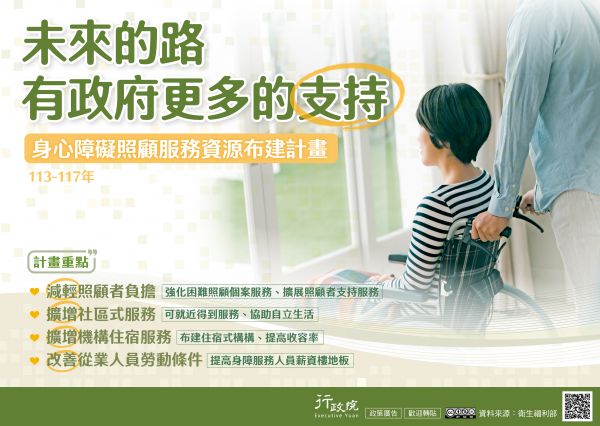 二、為擴大對身心障礙者的照顧,政府推動服務再升級的「身心障礙照顧服務資源布建計畫(113-117年)」,並減輕家庭照顧者負擔、改善服務人力勞動條件。